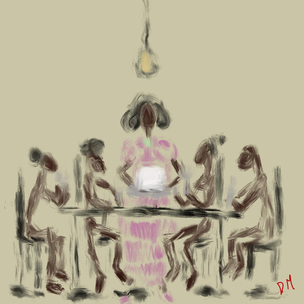 time in prison and everything they went through. This can also be seen in his painting entitled “bred,” where Milton depicts a family of 5 at the dining room table. The table is more like a card table in appearance, the mother, dressed like she’s from the 1950’s in the middle, holds a tray with a brick of cocaine in the shape of a loaf of bread. There’s rats along the floor, on each side her children flank her, their brown silhouettes skinny and frail. Once again there is implied art historical religious reverence in the composition, as Milton illuminates a personal trauma. There is no adult male in the picture. Milton does not shy away from his lack of role models, or his time as a drug dealer in his music, nor in his paintings. In another painting “self portrait,” a bright red background with two 9mm’s that mirror one another forming eyebrows and eyes, the trigger the pupils, and a bright white line underneath that one can only understand as cocaine knowing Milton’s past. Yousee a face at first even though there is none there, it’s not happy, it’s not sad either, angry maybe? Mad? Once again the punch of color and simplification pack a wallop, is this really how Milton see’s himself? There is a self scrutiny to the work where you get the sense that Milton is aware of who he is, but also how others see him, he plays off those assumptions of competency and identity frequently in terms of the variety, or range, of skill and complexity in his paintings; showing that Milton probably always had more proficiency with the brush than his audience realized. At the gallery we asked Milton’s longtime friend, and hype man, Braxton Tells, also known as T RAX, about Milton’s origin’s as a painter. He had this to say,