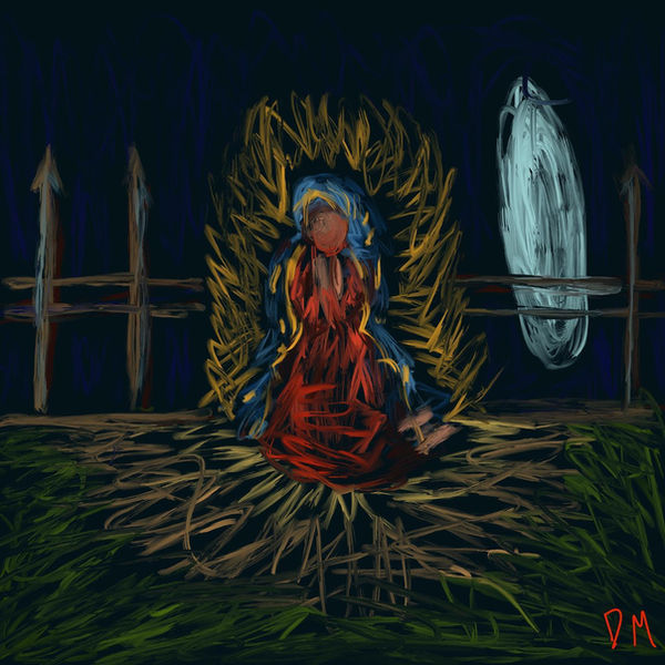 Take for example another painting in this series, “On My Mama” where he crudely depicts the Virgin Mary in the center of the painting laying in what appears to be a bed of hay, a fence separating her from a reddish-brown background. On one side of the figure there is a large opal oval that perhaps could be interpreted as a doorway, or a stretched out moon. That is until you realize that the fence post behind the figure on the other side is shaped as an “H” and suddenly all you can see is “HO.”